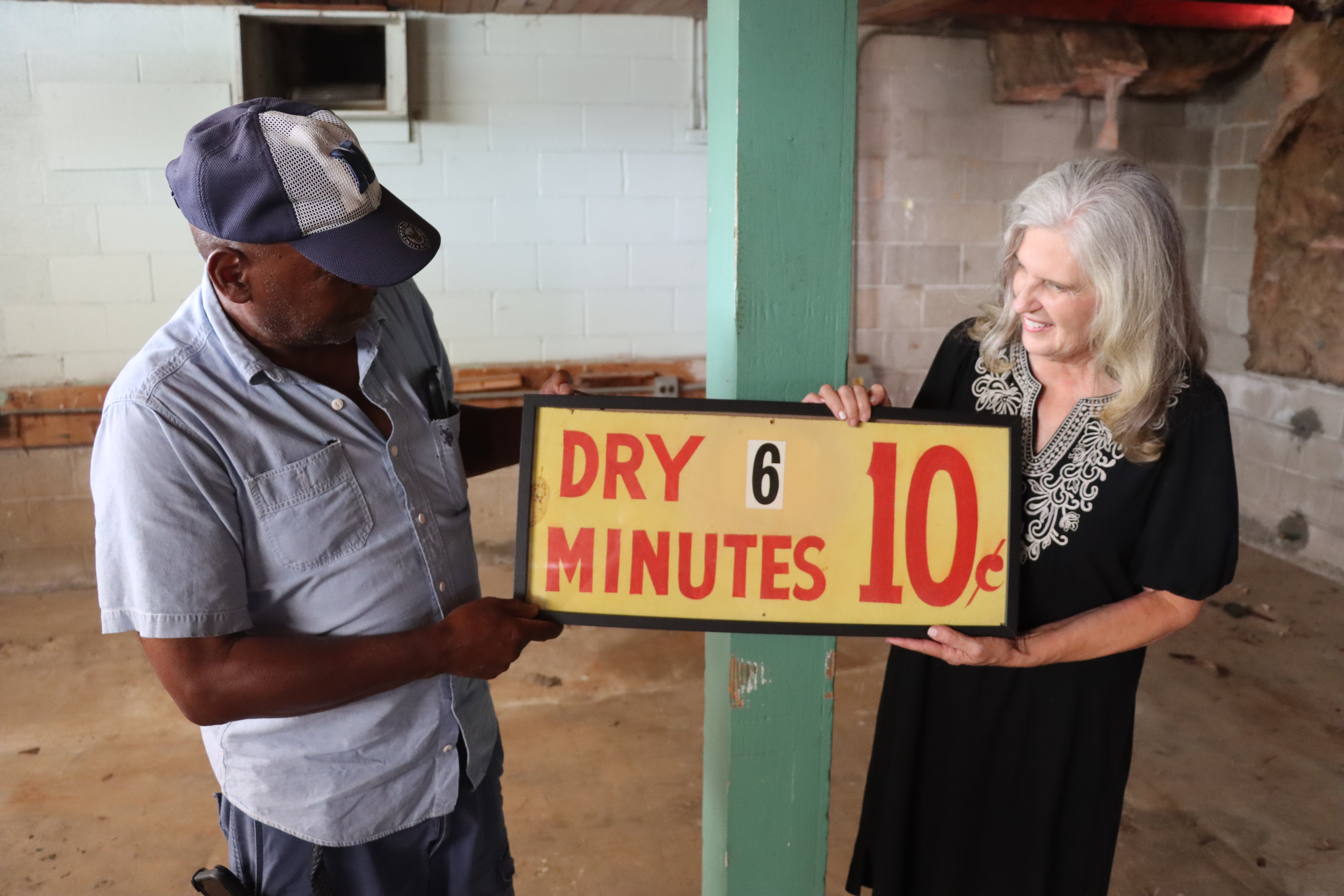 Theadee Sebree and Susan Lee reminisce about the Sunshine Launderette while looking at a framed piece of signage from the laundromat’s history. Lee, the building’s current owner, is in the process of remodeling the historical building to prepare for a new business to continue adding to the building’s stories.